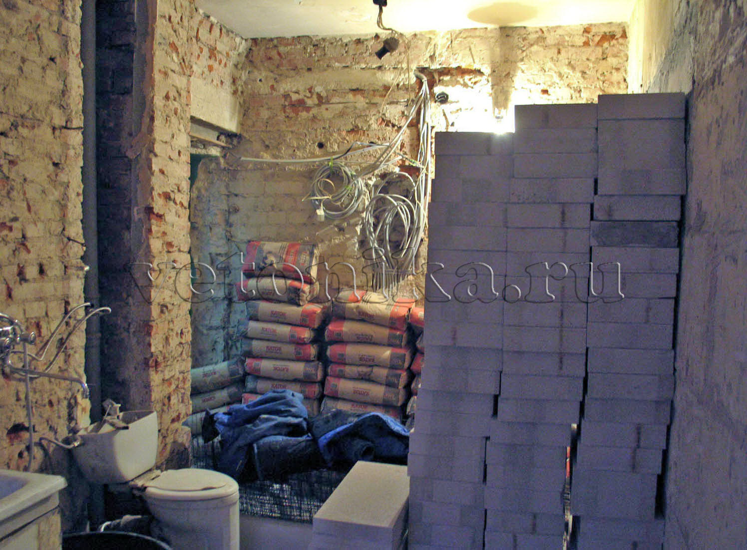 Возводим перегородку в гостиной. За перегородкой, общий для обеих комнат коридор, ведущий в санузел и прихожую. |