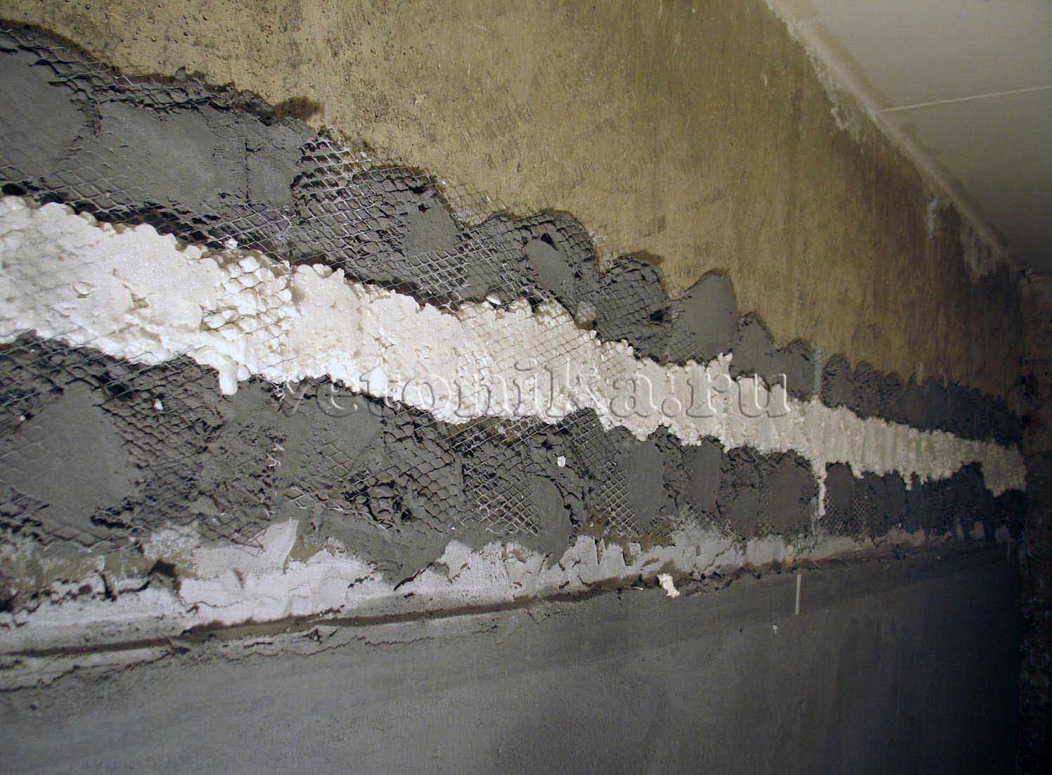 Чтобы штукатурка не отвалилась, нам нужно обработать этот участок стены. На гипсовый раствор крепим металлическую штукатурную сетку. |